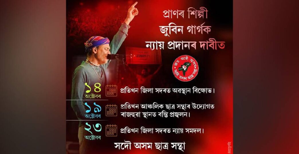 The All Assam Students’ Union (AASU) has announced a three-phase statewide agitation demanding justice for late singer and cultural icon Zubeen Garg. The student body said the agitation will begin with a district-level sit-in protest on October 14, followed by candlelight vigils on October 19, and a symbolic “Nyay Samdal” or Justice March on October 23 across Assam.